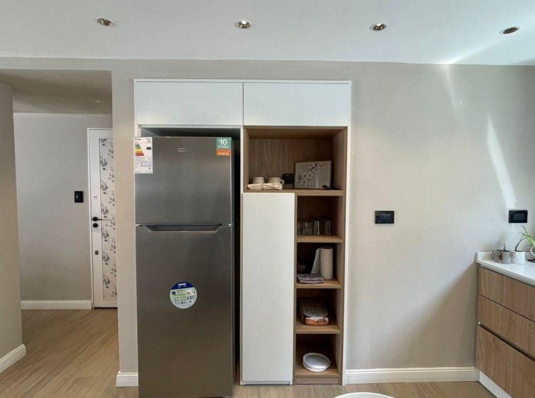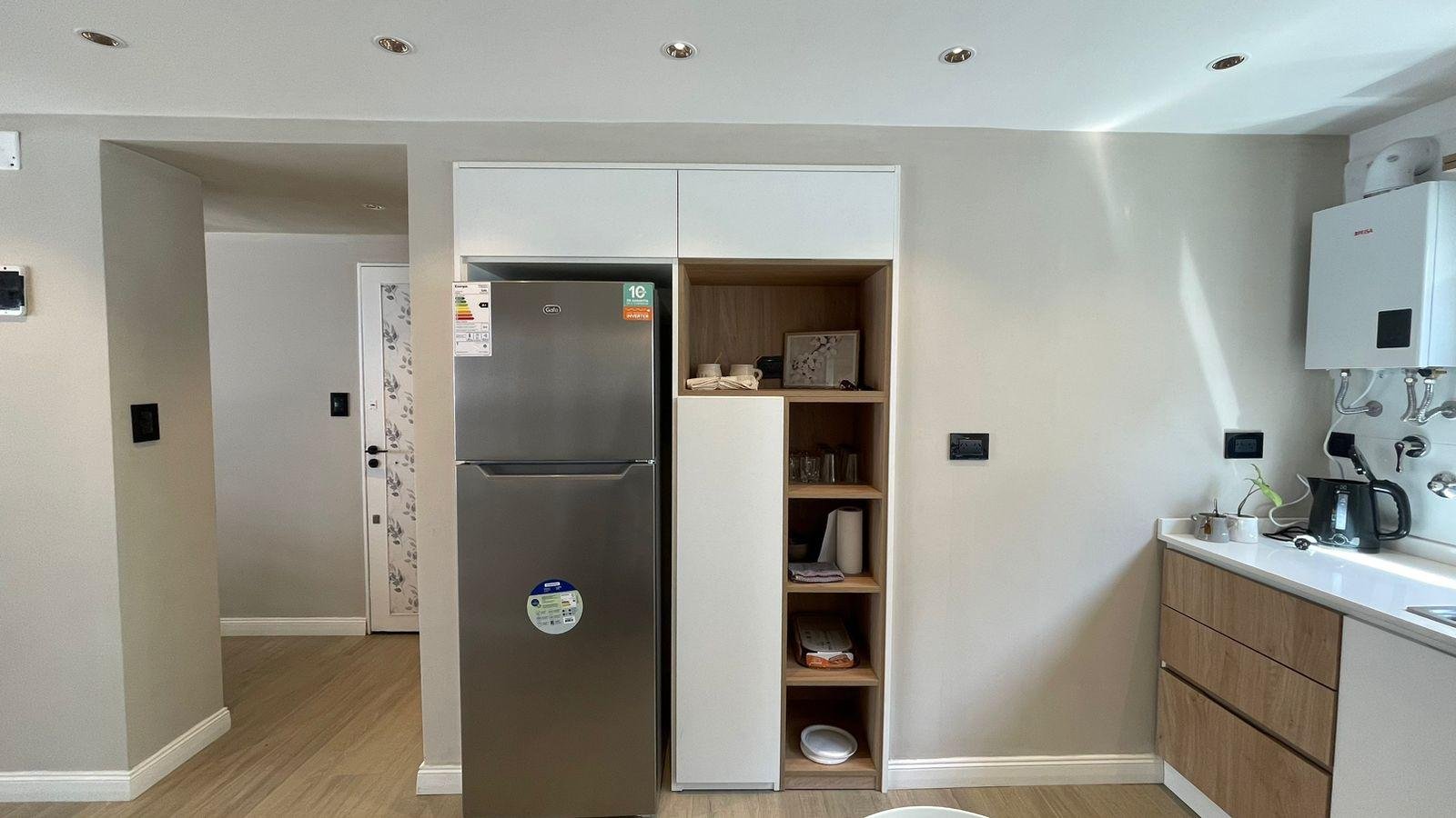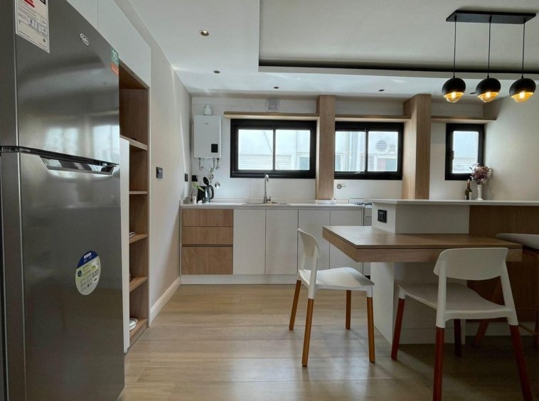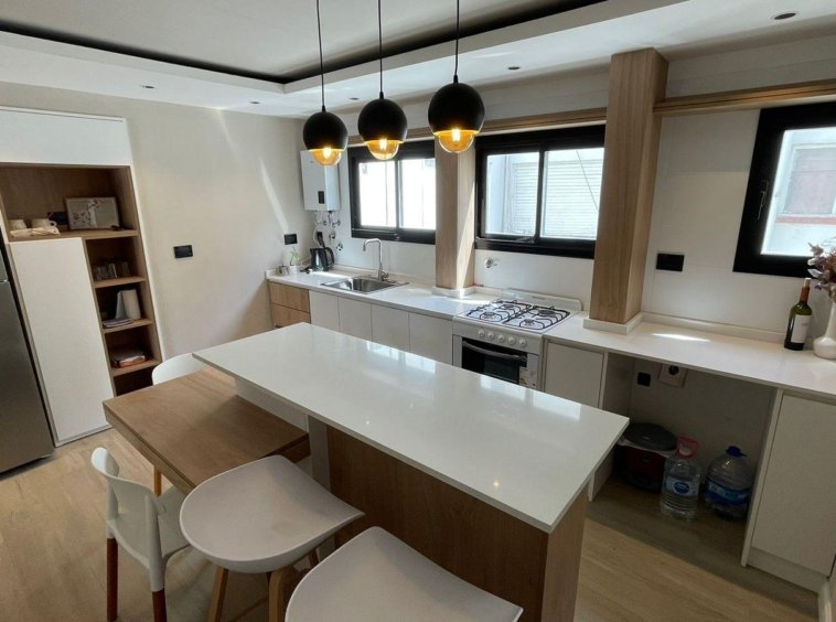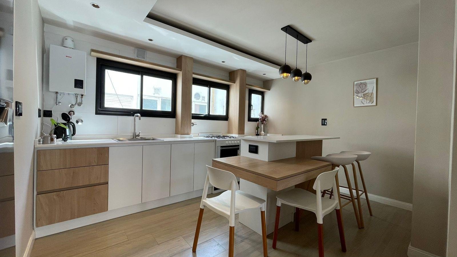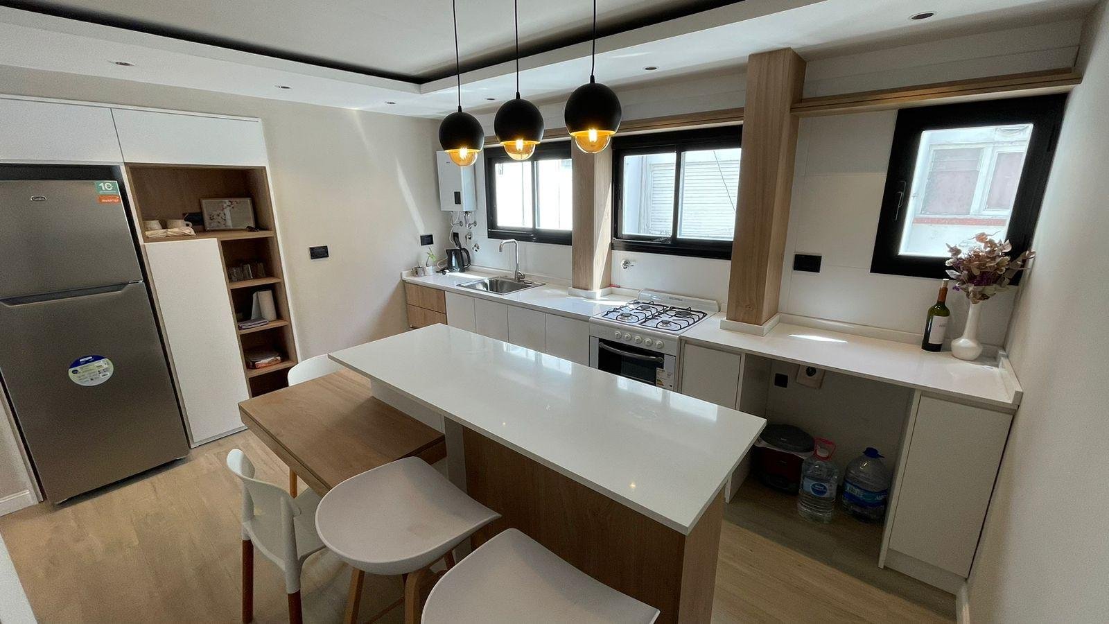Cocina comedor con isla, equipada con cocina, heladera, calefón, vajilla completa.