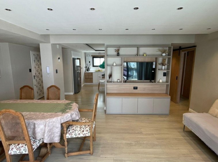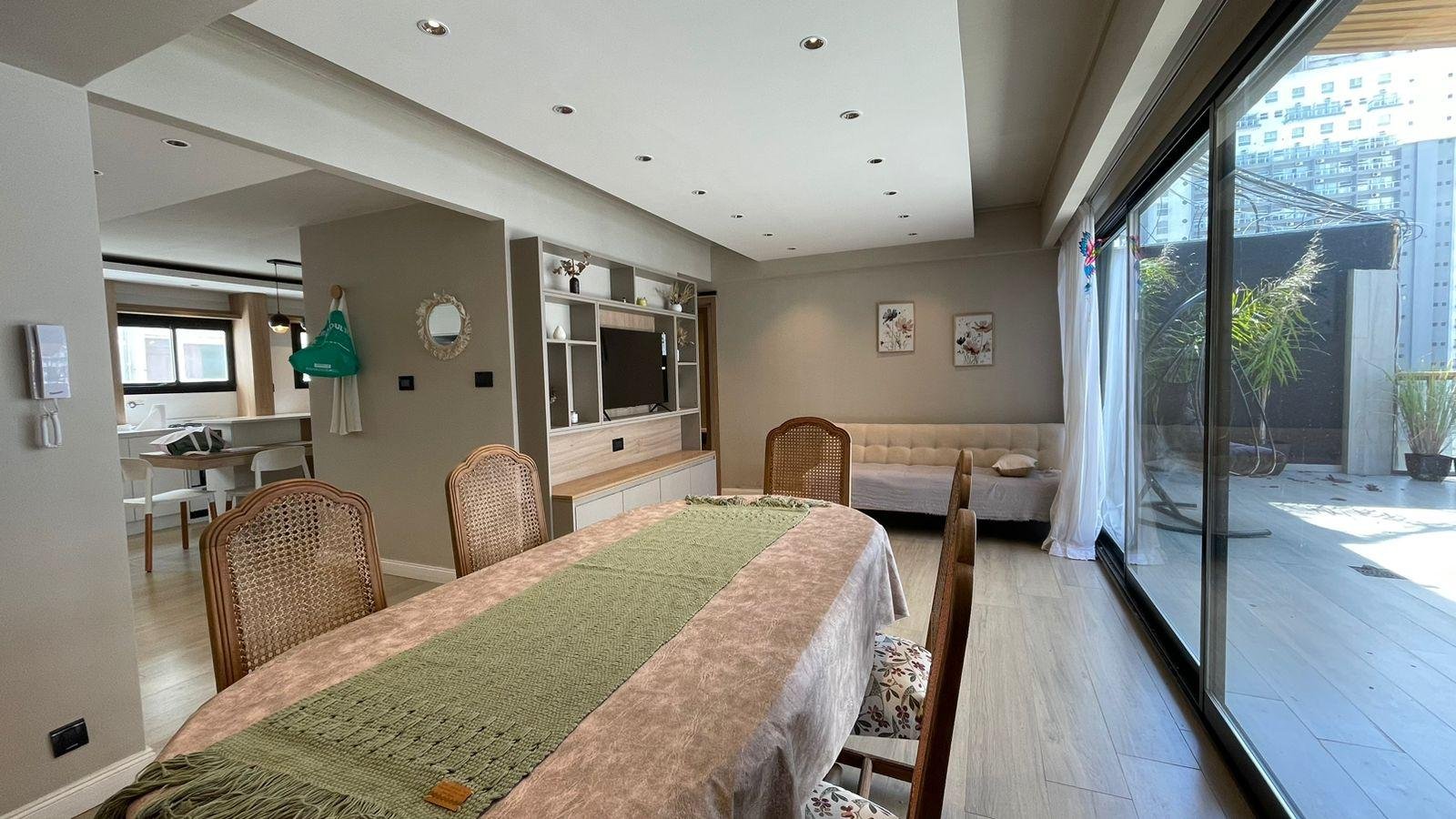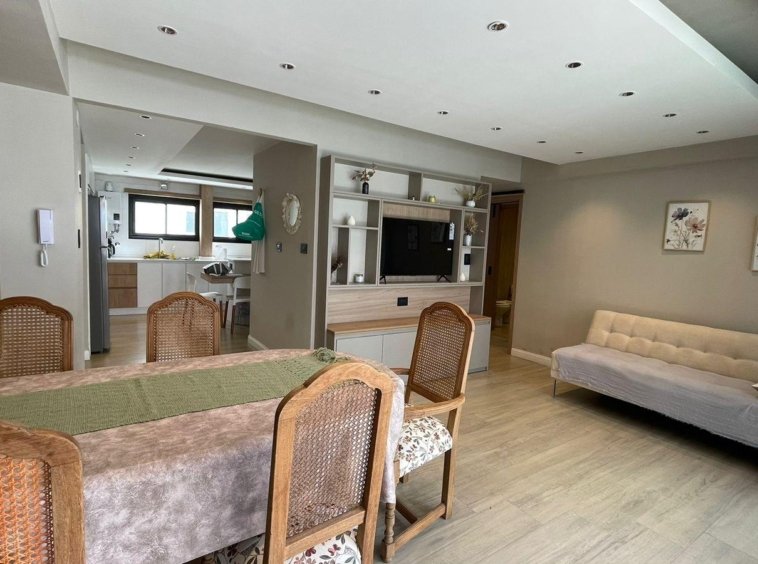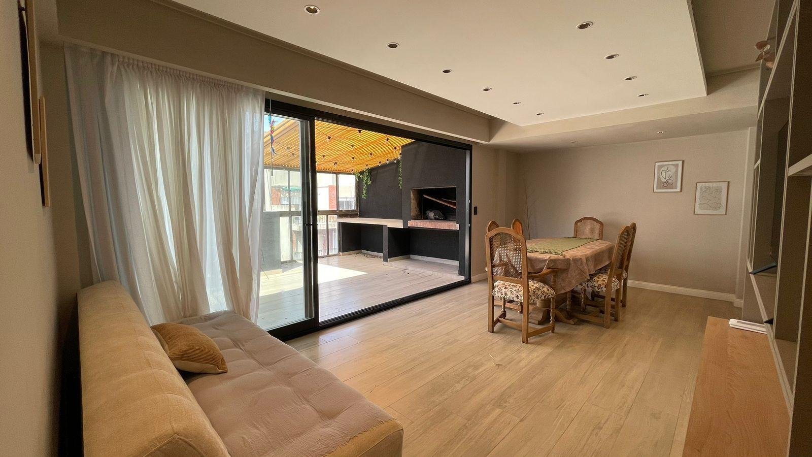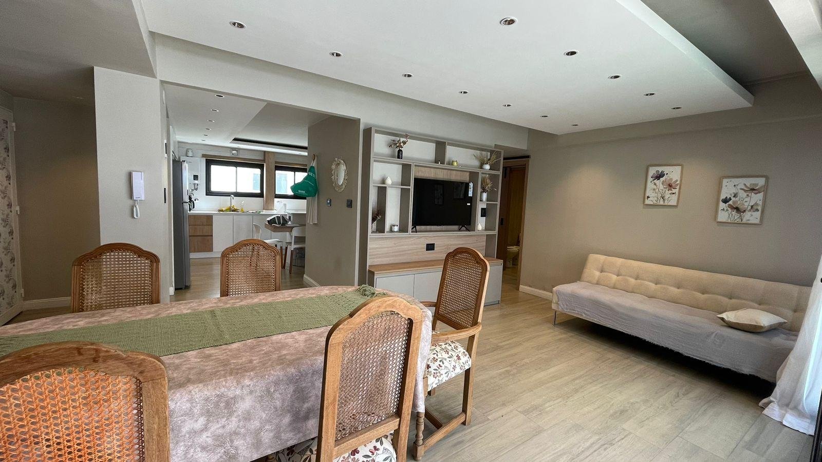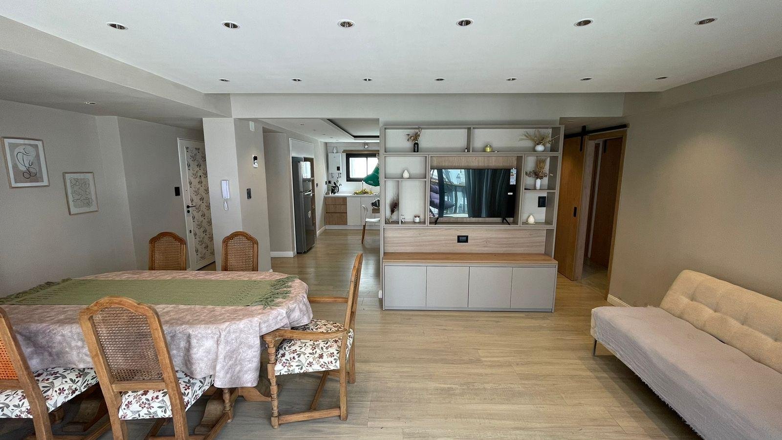 Amplio living comedor a la calle con pisos porcelanato, mesa con sillas, sillón cama, TV con cable y Wifi, calefacción