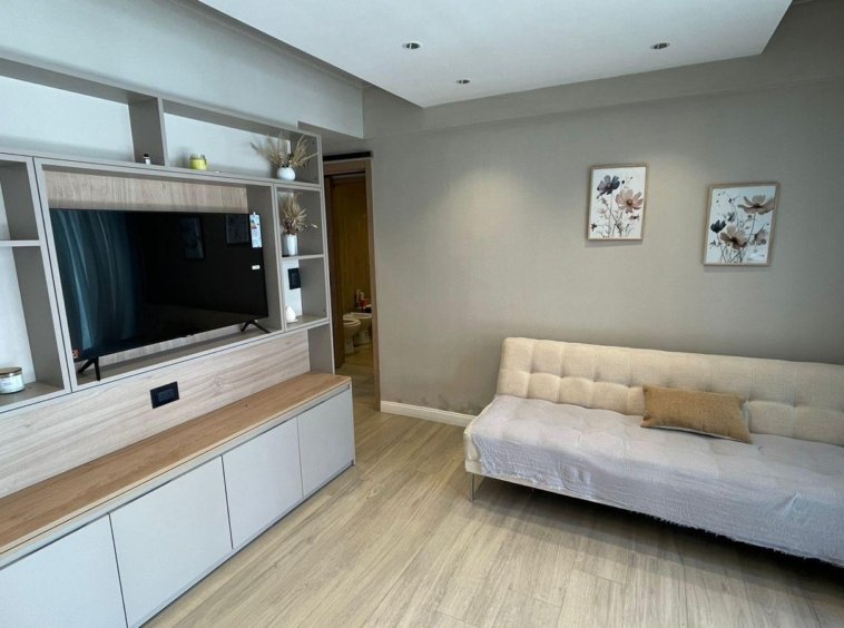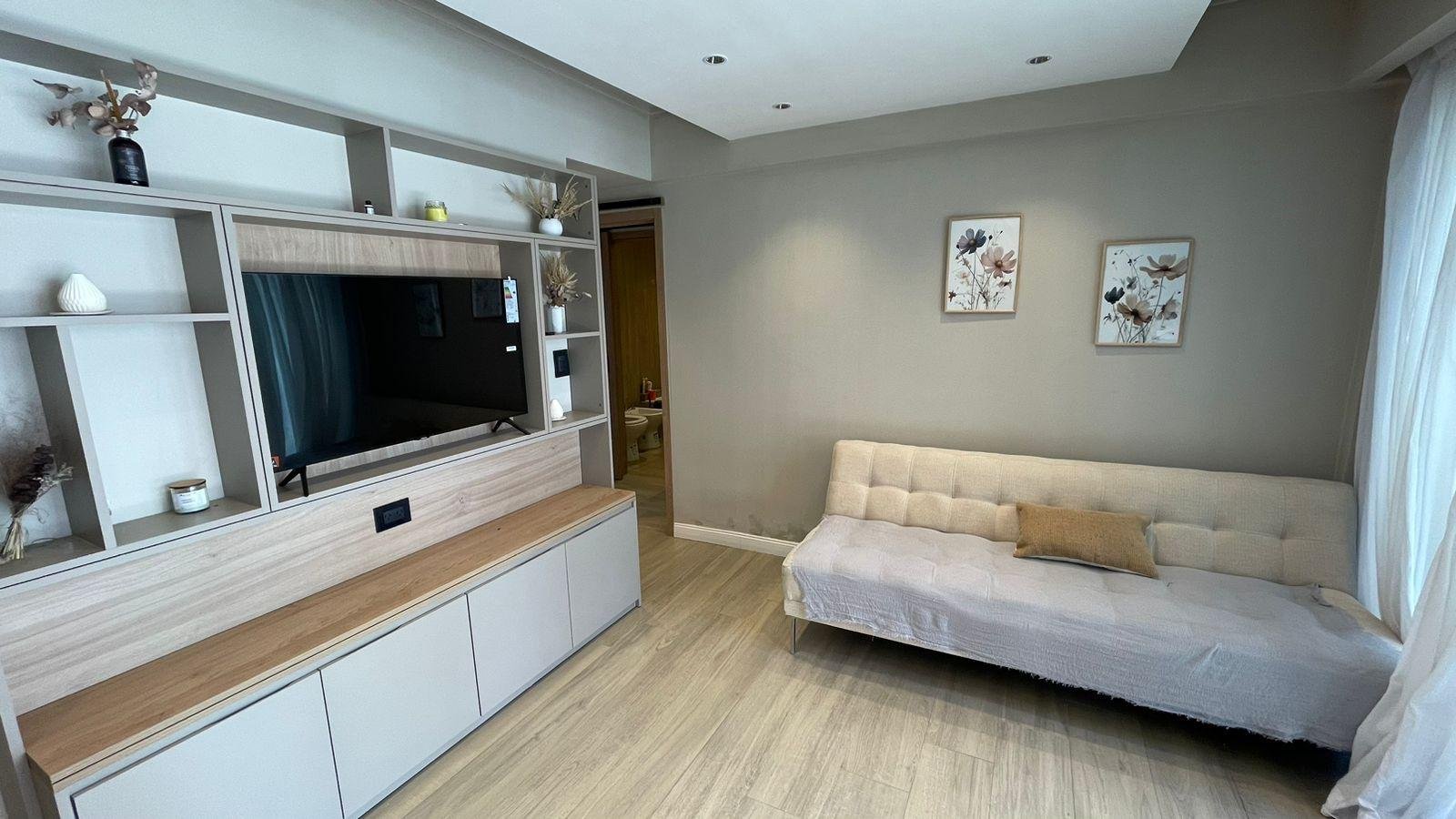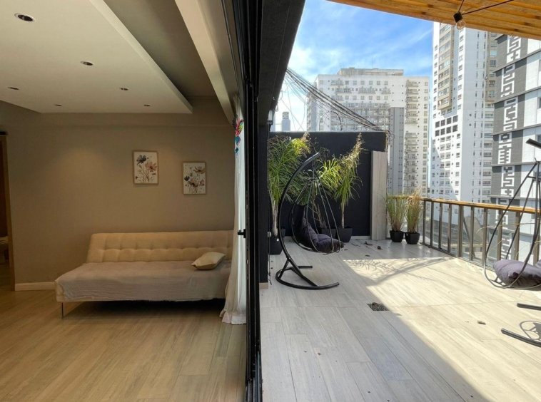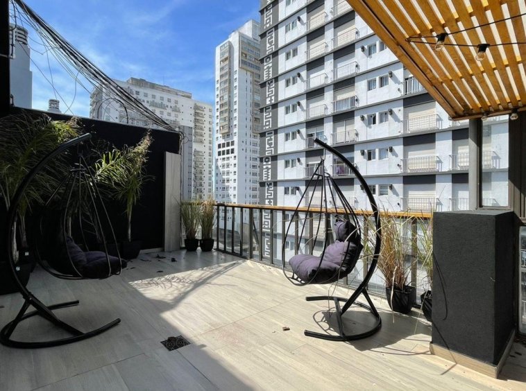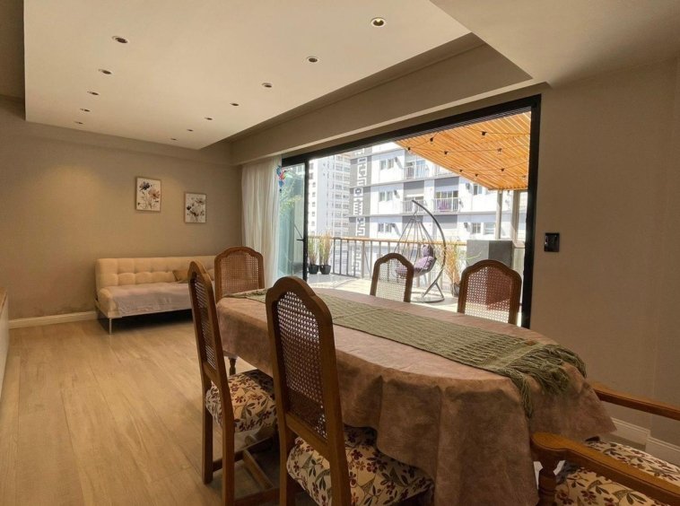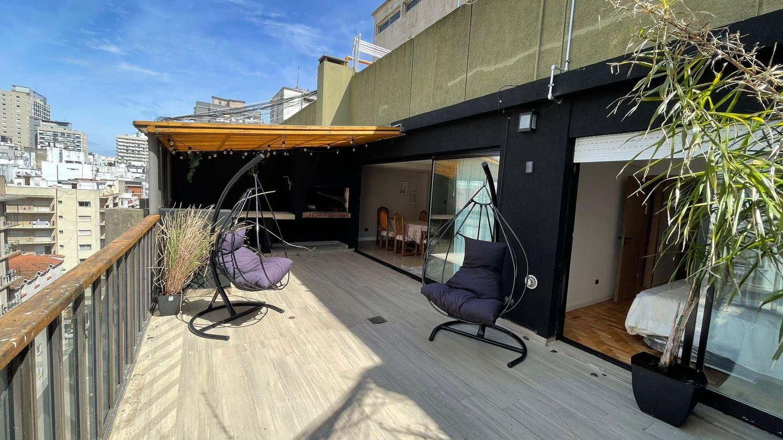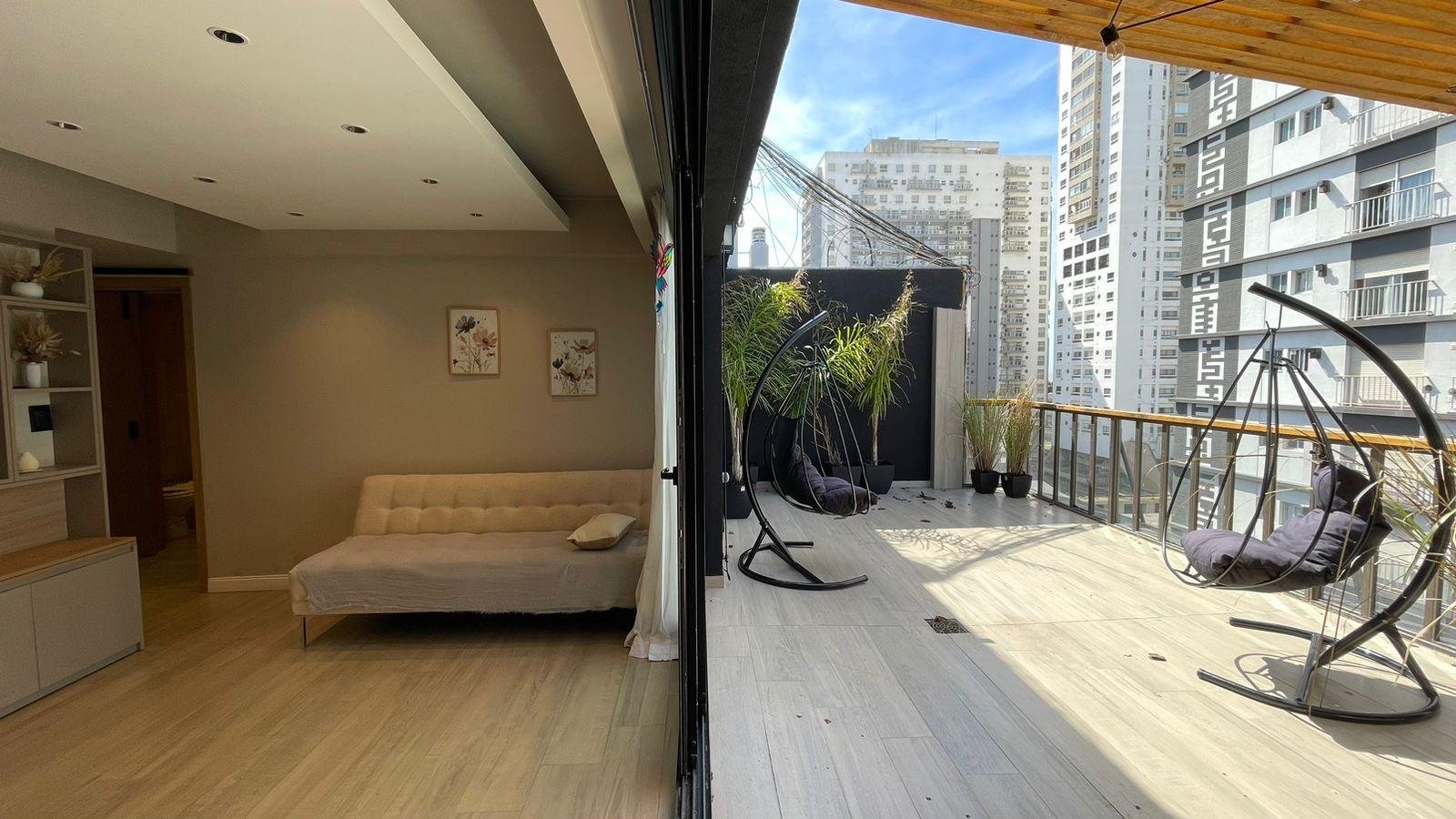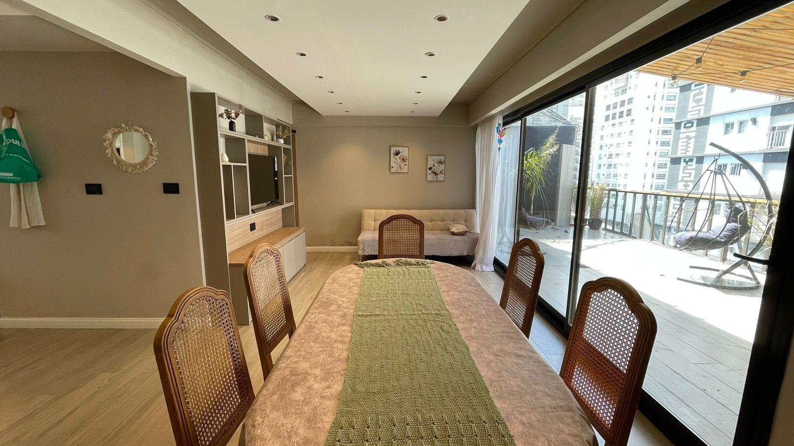Amplio living comedor a la calle con pisos porcelanato, mesa con sillas, sillón cama, TV con cable y Wifi, calefacción