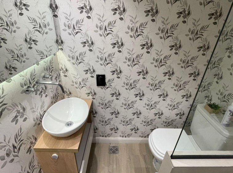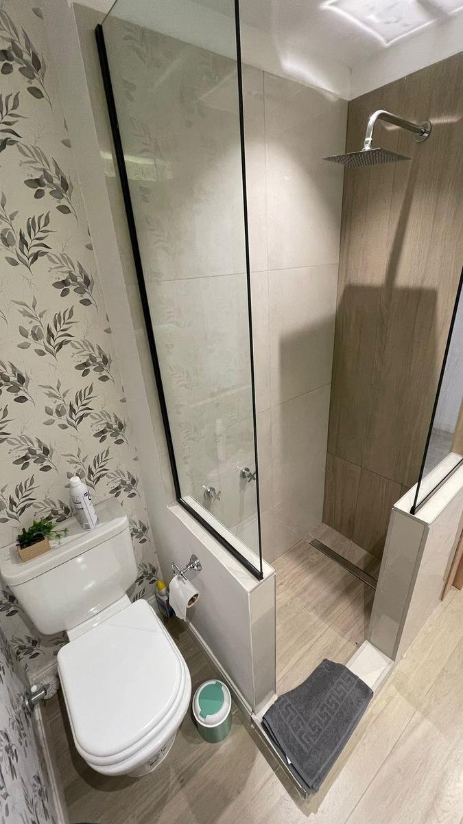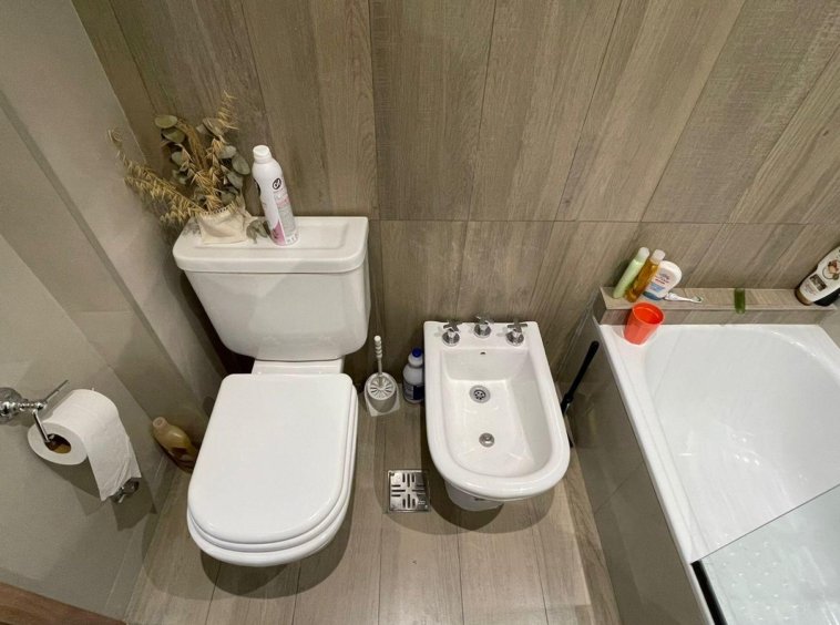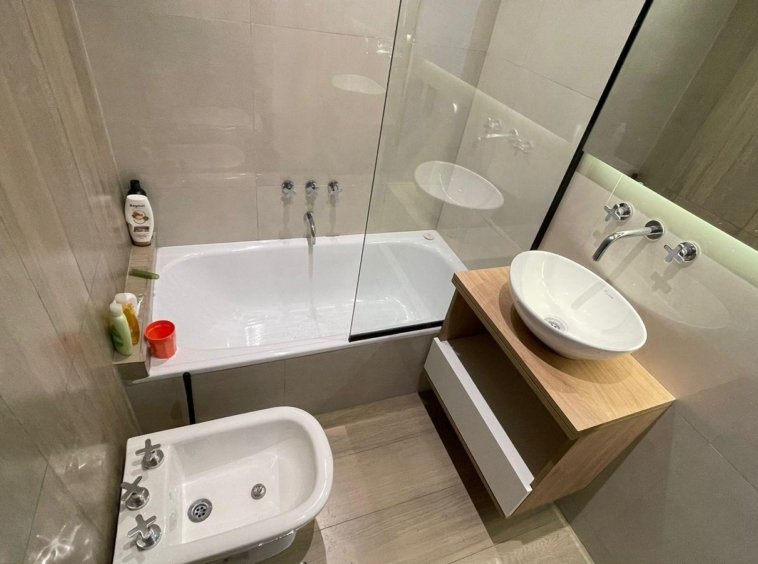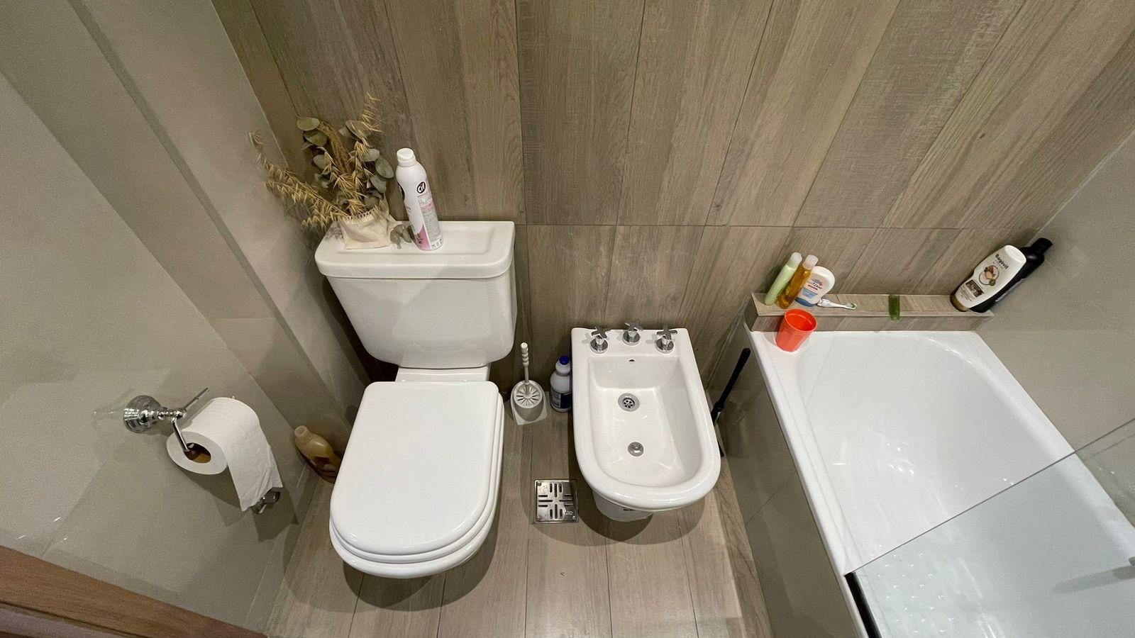 Baño principal completo con bañera, revestido en cerámicos y porcelanato.