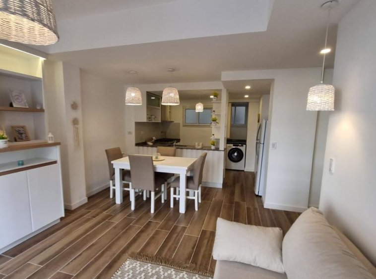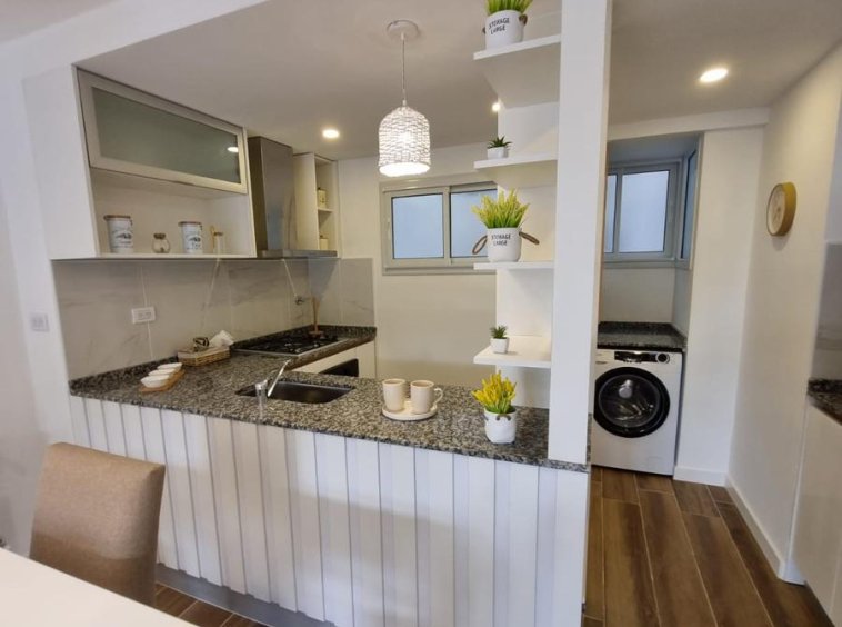 Cocina comedor amplia separada revestida en cerámicos, equipada con Heladera, Muebles a medida y lavarropas