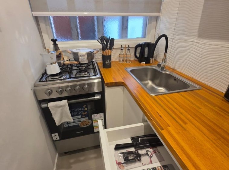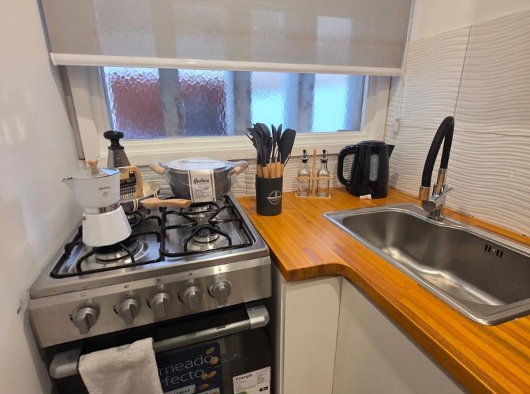 COCINA SEPARADA CON LAVARROPAS, EQUIPADA CON ELECTRODOMESTICOS A ESTRENAR, COMO ASI TAMBIEN VAJILLA Y ROPA DE CAMA.