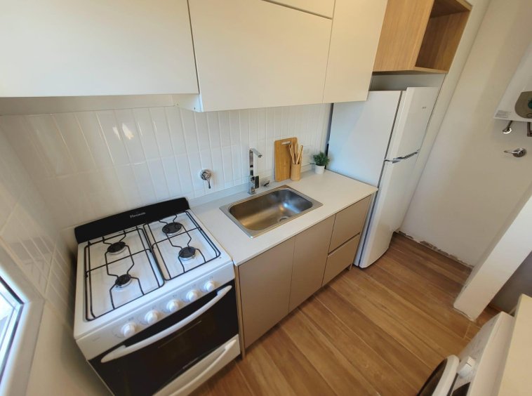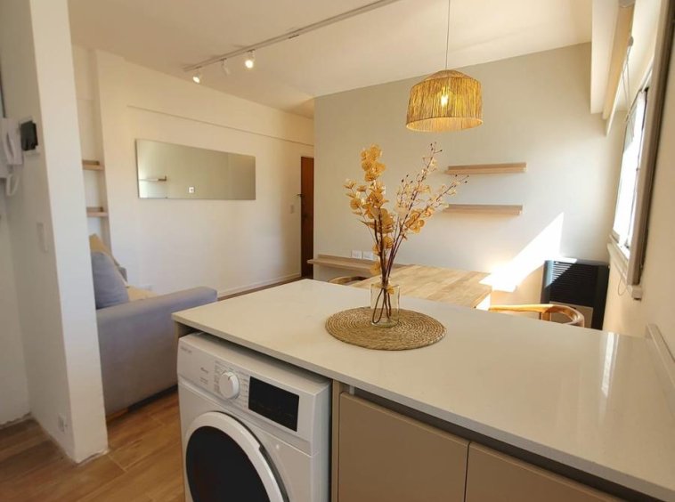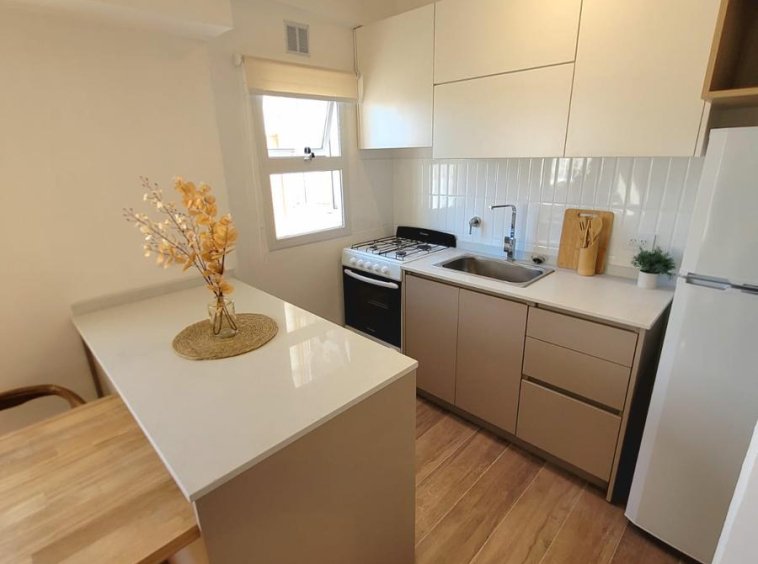 Cocina con muebles a medida, equipada con Heladera con Freezer, Lavarropas, Cocina y Calefon