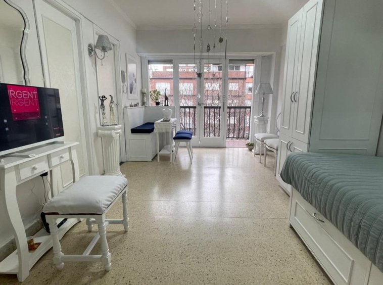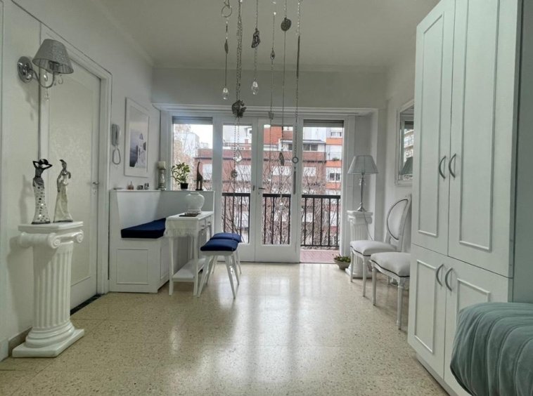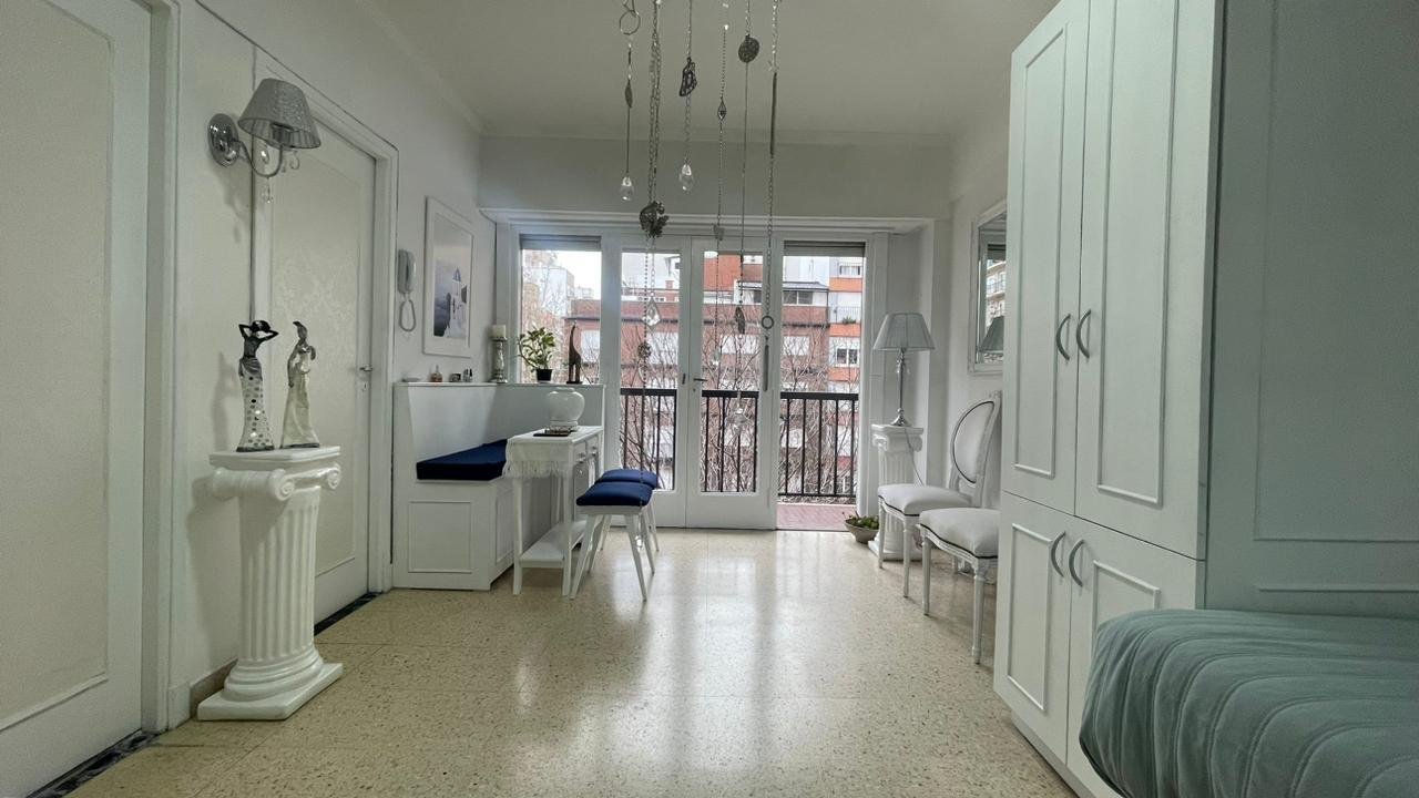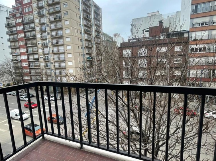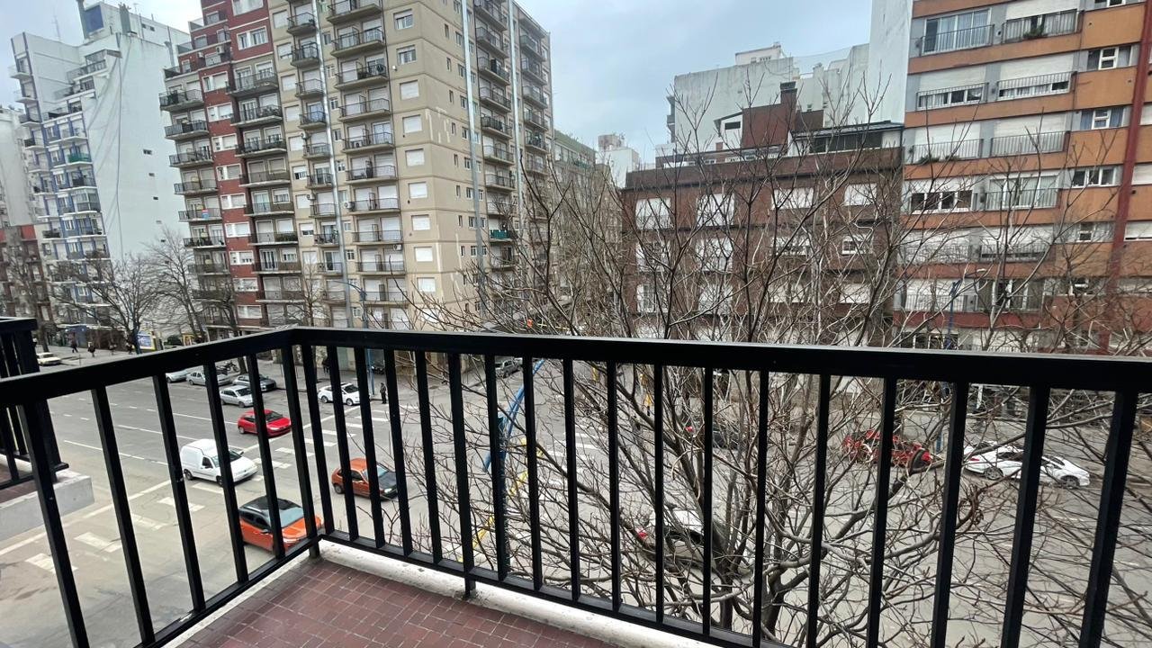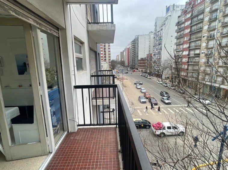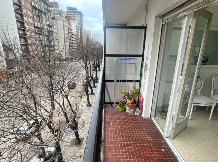 Estar living comedor a la calle con pisos en granito, balcon saliente sobre Av Colon
