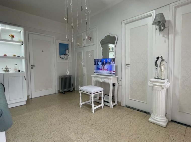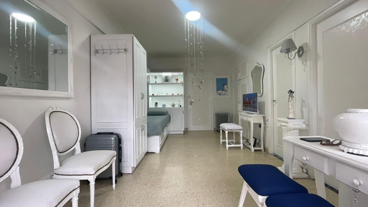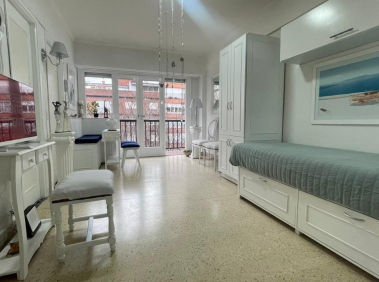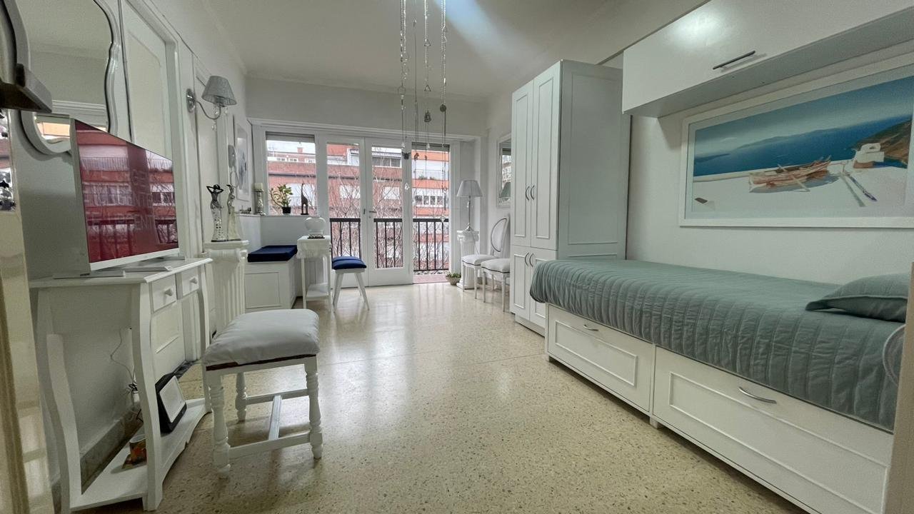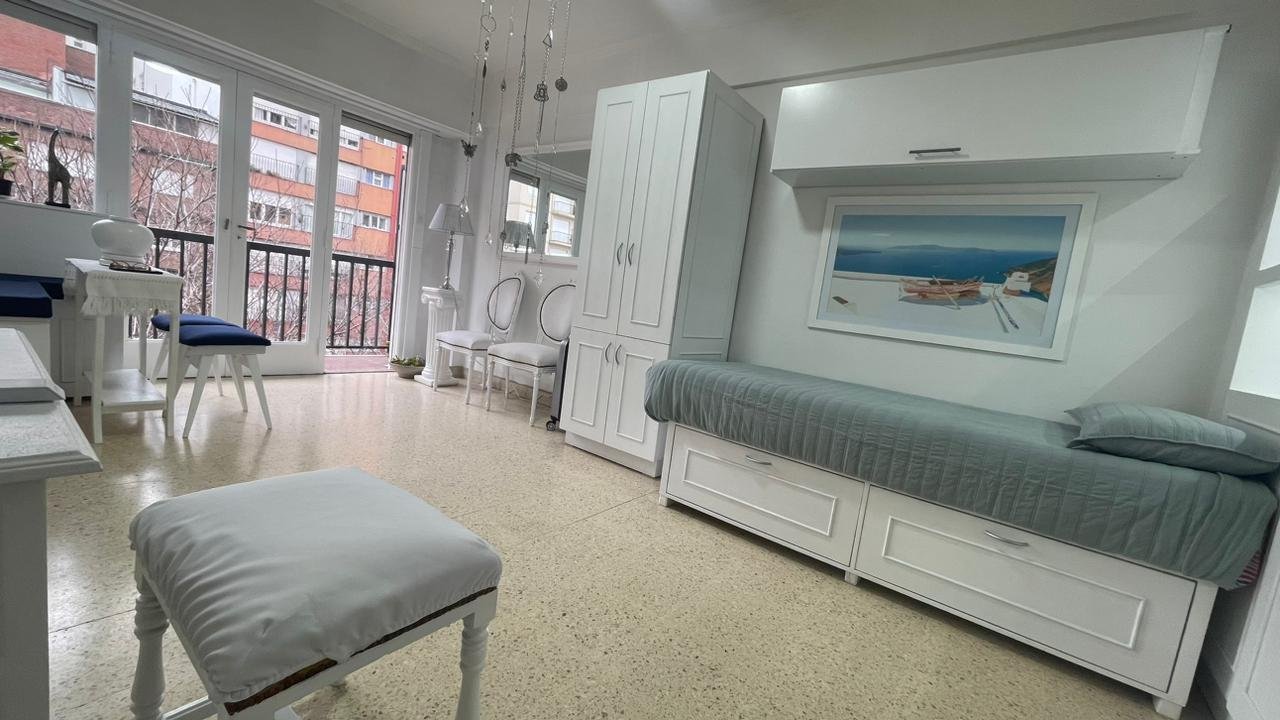 Estar living comedor a la calle con pisos en granito, balcon saliente sobre Av Colon