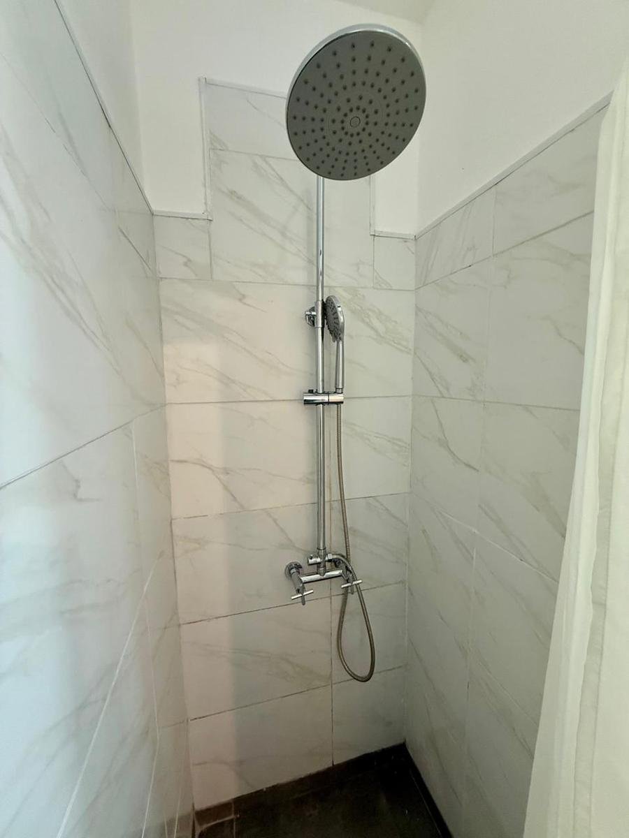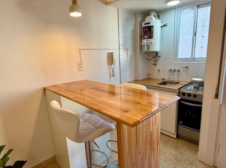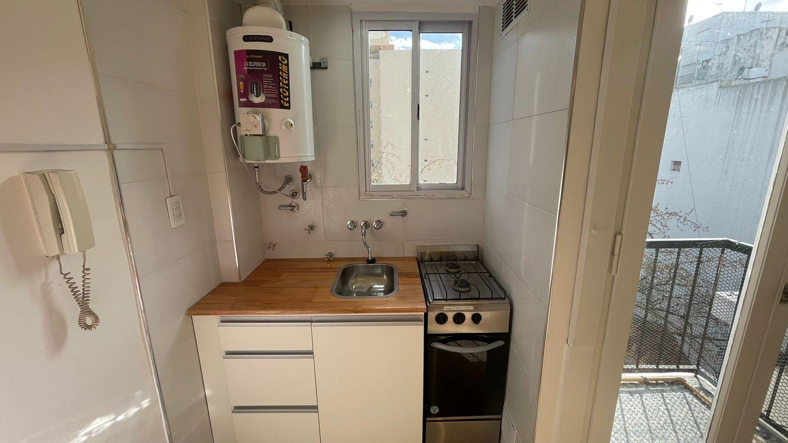 Cocina semi integrada revestida en cerámicos, equipada con cocina, termotanque, y muebles a medida