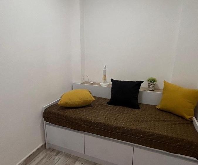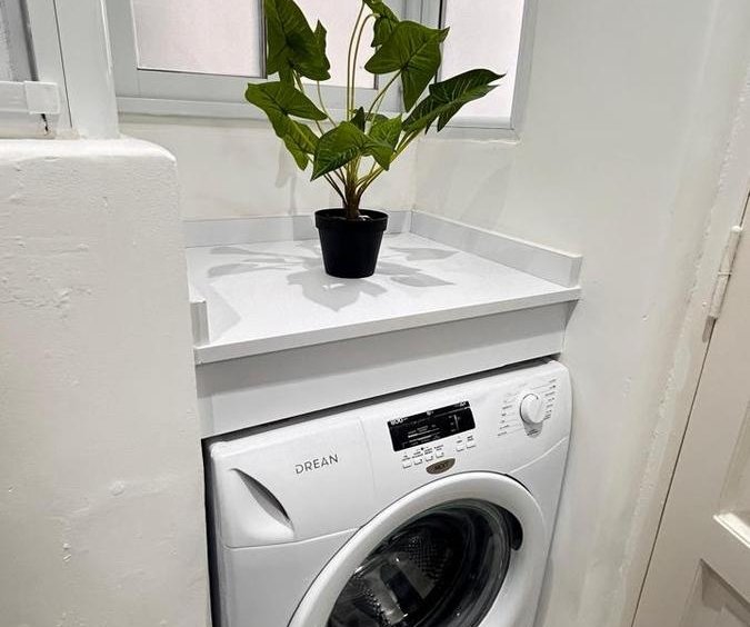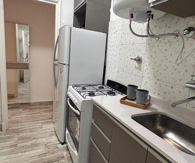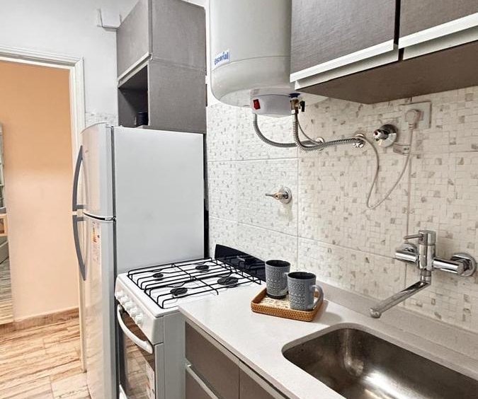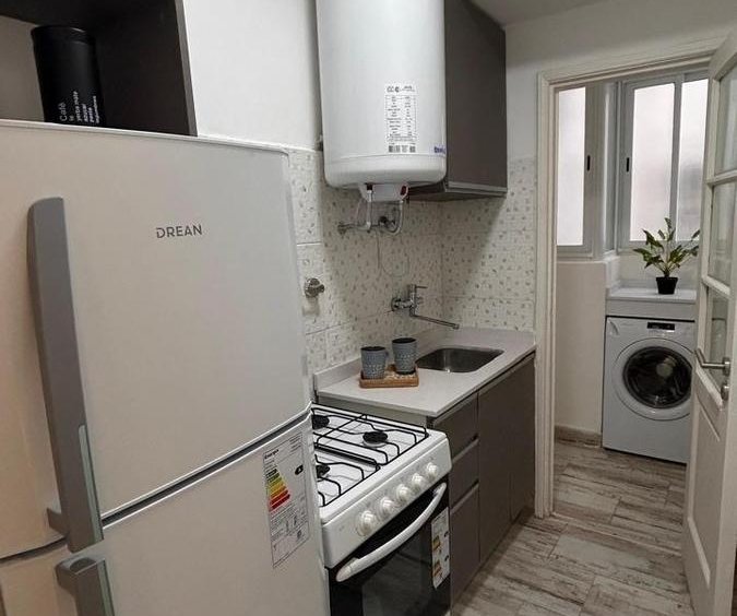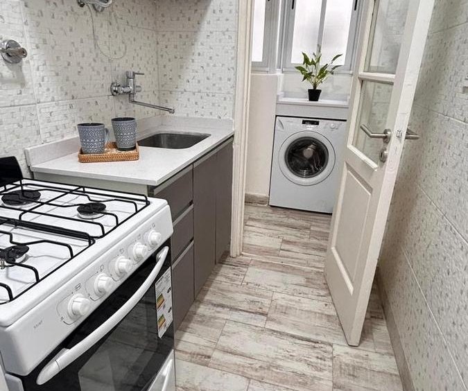 Cocina separada con electrodomésticos, muebles a medida y lavarropas conectado.