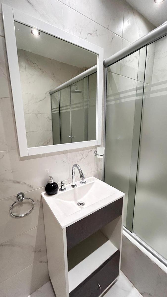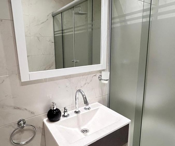 Baño completo revestido en ceramicos con mampara y vidrio templado.