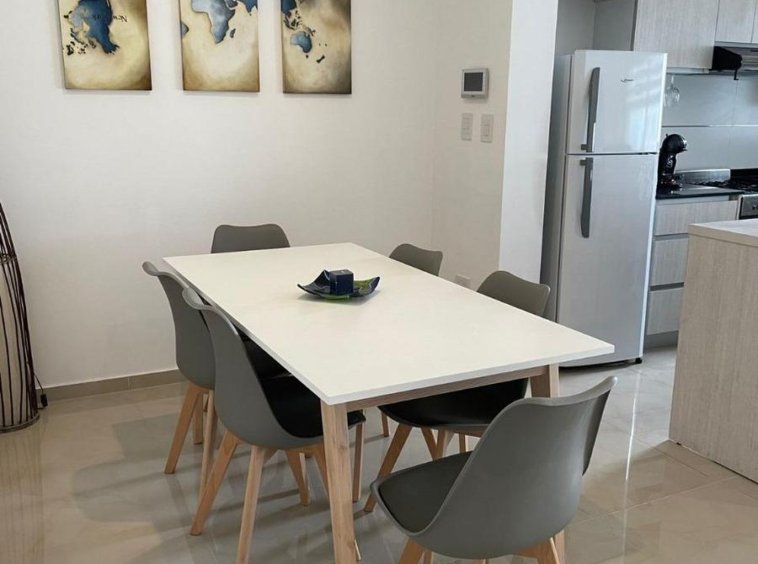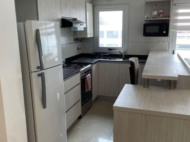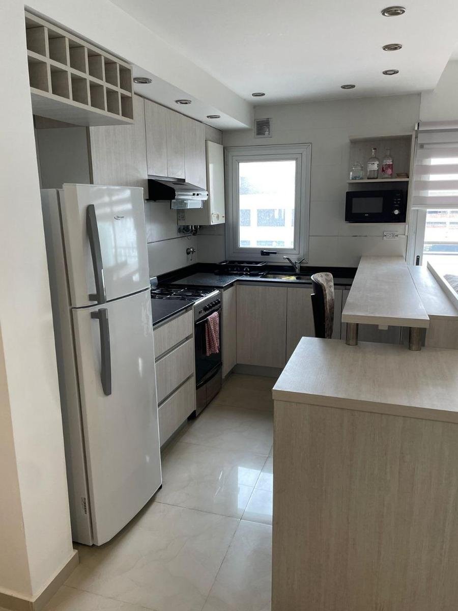 Cocina semi integrada con barra, revestida en cerámicos. Equipada con cocina, heladera, caldera y muebles a medida