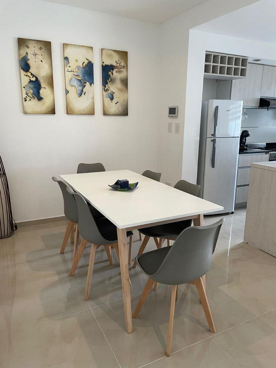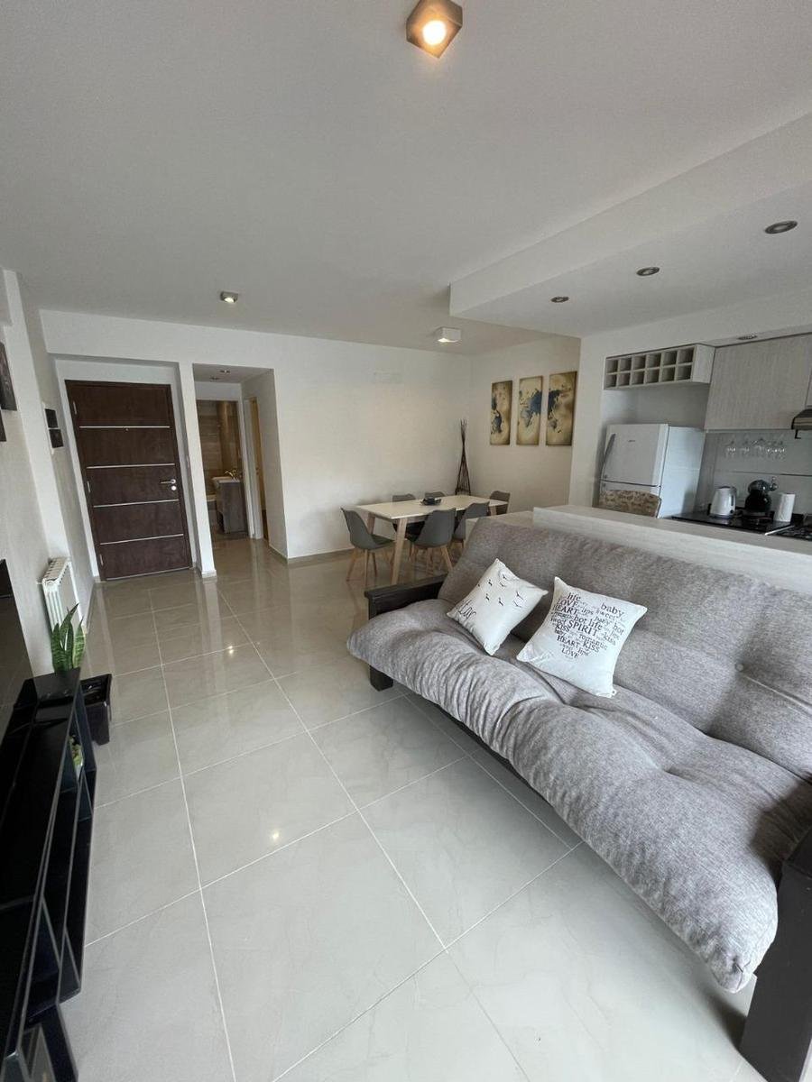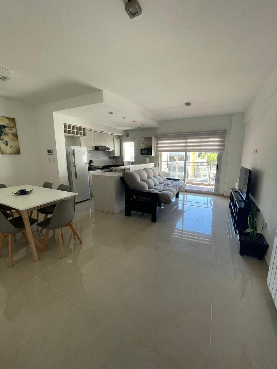 Amplio living comedor apaisado con pisos porcelanato y salida al balcon.