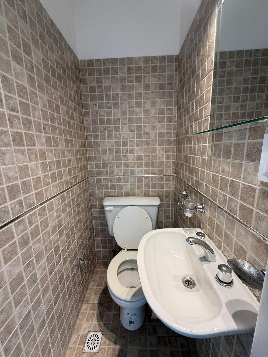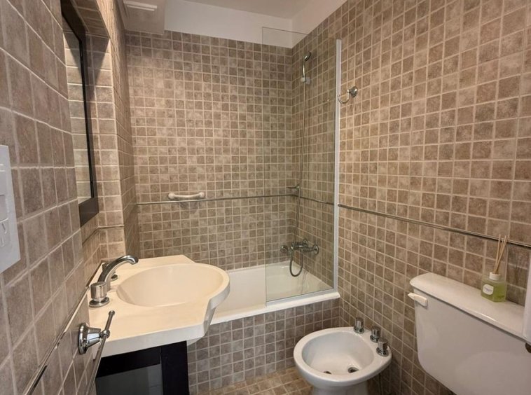 Baño completo revestido en cerámicos, ducha y mampara vidriada
