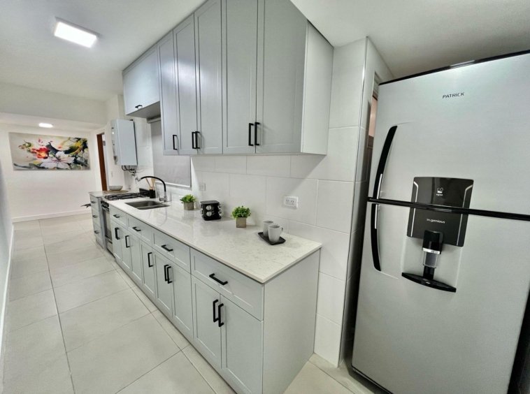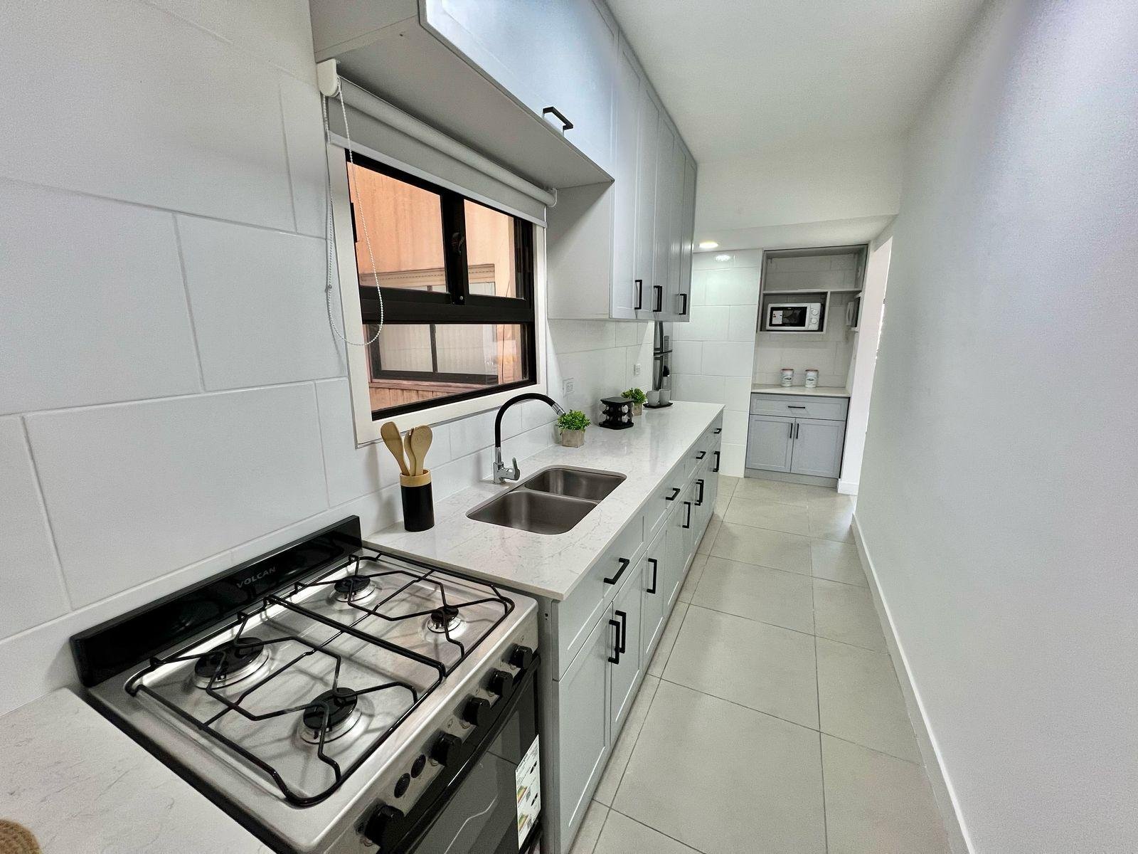 Cocina amplia separada revestida en ceramicos, equipada con cocina, calefon, heladera y muebles a medida